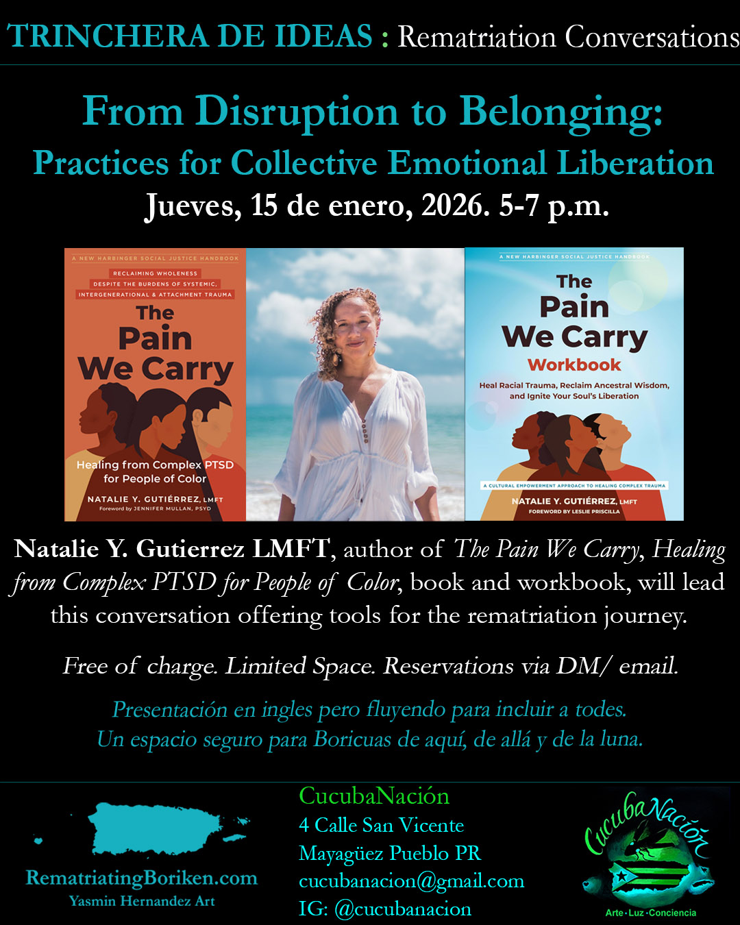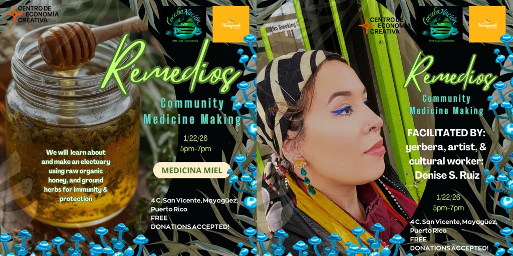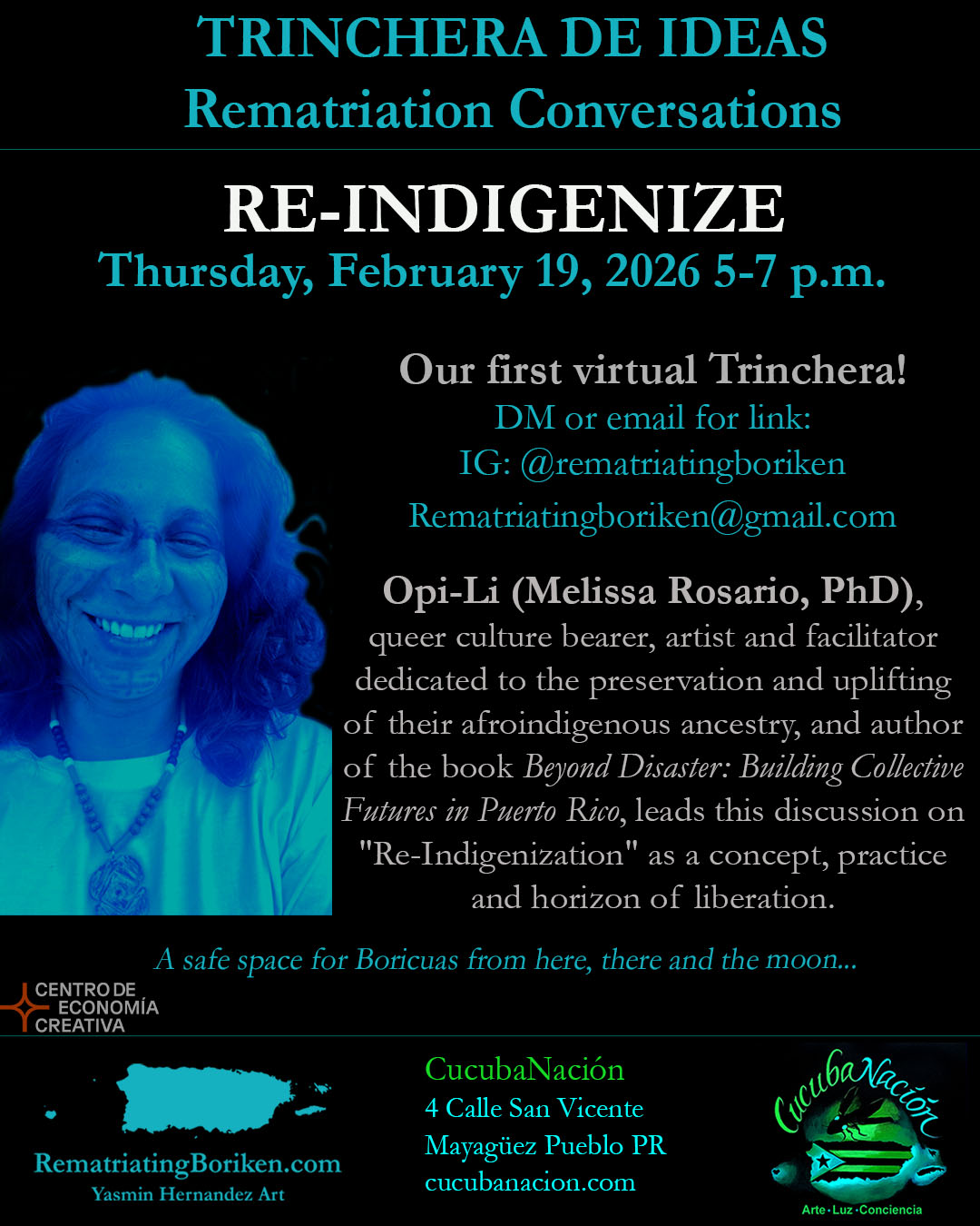 Rematriating Borikén events are held in Mayaguez, Borikén at CucubaNacíon, the artspace of project creator Yasmín Hernández. These include the monthly series Trinchera de Ideas, (every third thursday, 5-7pm) and other events featuring folks on their rematriation journey. Off-site events will be posted on this page as well. Also, stay tuned for forthcoming virtual events./
